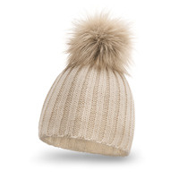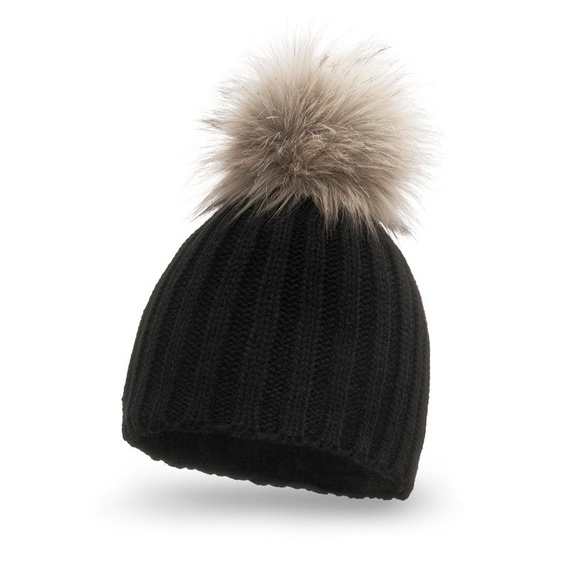 Mikos Damen Strickmütze mit Fellbommel Bommelmütze Zopfmuster oder Rippstrick mit großem Kunstfellbommel