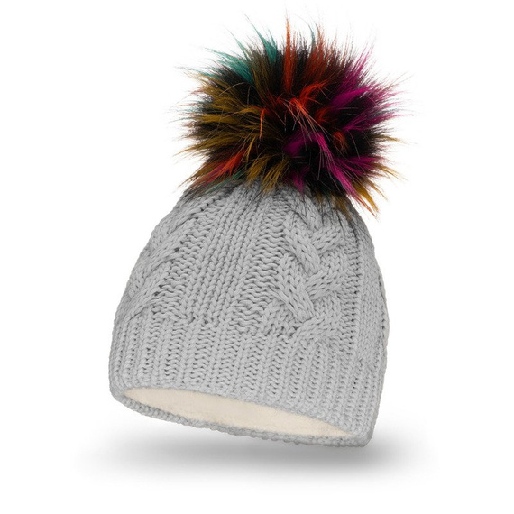 Mikos Polska ciepła Damska czapka zimowa w warkocze gruby splot podwójna podszyta polarem z dużym kolorowym pomponem na narty polski producent polski produkt HAT 684 szary
