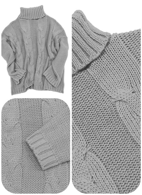 Wywijany kołnierz typu golf, który nie przylega mocno dzięki czemu zapewnia komfort i wygodę. Wykonany z miłej w dotyku i dobrej jakości przędzy o splocie typu warkocz.