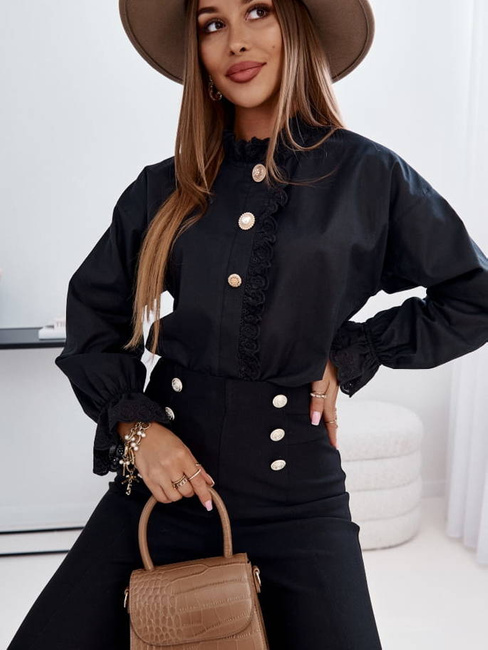 Zapinana na guziki zakryte haftowaną patką. Atutem są trzy duże guziki wszyte wzdłuż bluzki.