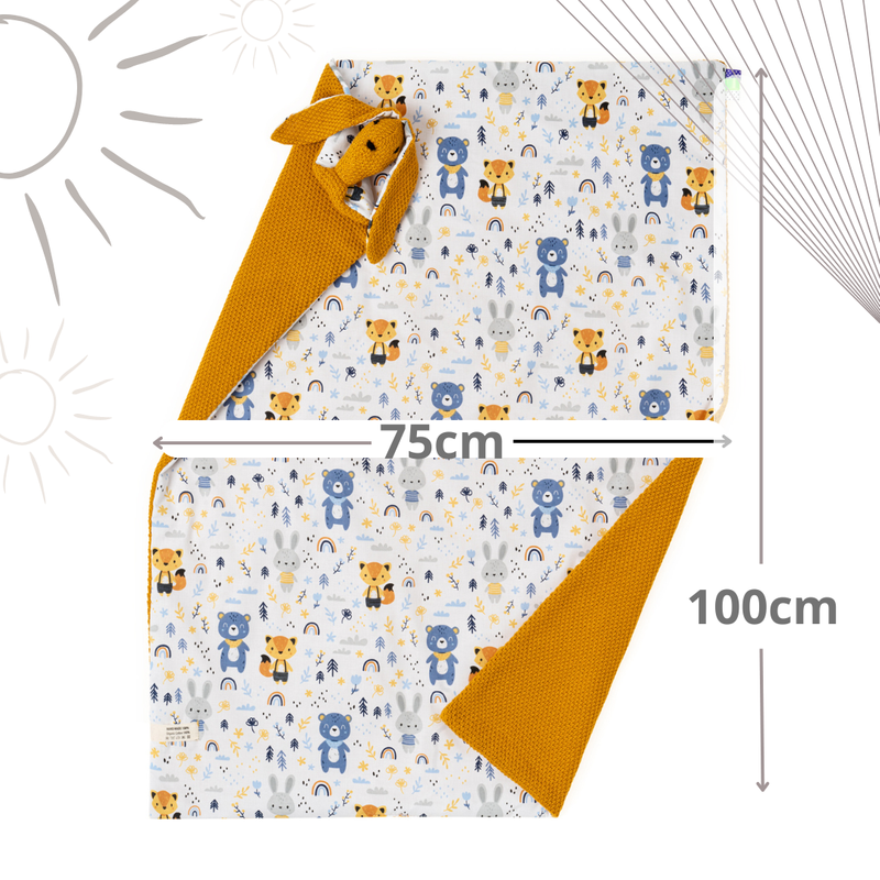 Mikos Kocyk dziecięcy z ozdobnym króliczkiem wykonany z 100% bio bawełny organicznej z certyfikatem GOTS dwustronny dzianinowy cienki na lato do wózka łóżeczka do przedszkola niemowlęcy tkany 1041 musztardowy/las