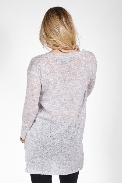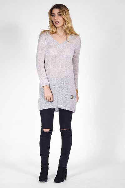 Mięciutki sweter z długim rękawem, nierozpinany. Wykonany jest z najwyższej jakości przędzy, dzięki czemu jest niezwykle delikatny i przyjemny dla skóry. Dekolt w kształcie litery V można lekko opuścić na ramię co doda każdej stylizacji charakteru. Niezwykle wygodny, oversizowy krój zapewnia całkowitą swobodę ruchów i maksymalny komfort noszenia.