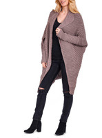Długi sweter damski bez zapięcia wykonany z grubej i miękkiej przędzy.