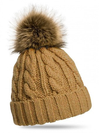 Mikos Damen Strickmütze mit Fellbommel Bommelmütze Zopfmuster oder Rippstrick mit großem Kunstfellbommel