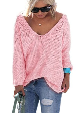 Opinie o Mikos Luźny Sweter damski w serek z dużym dekoltem w kształcie litery V 617 - różowy jasny